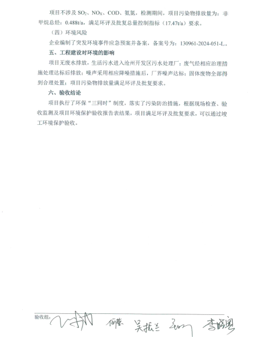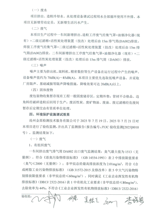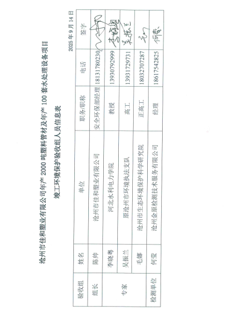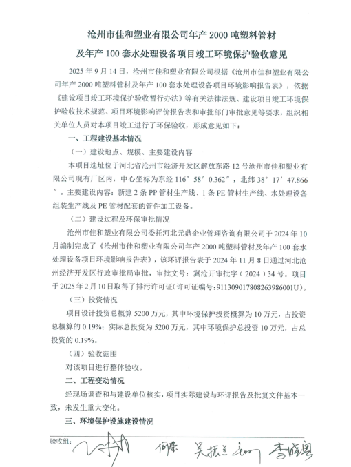 沧州市佳和塑业有限公司年产2000吨塑料管材及年产100套水处理设备项目竣工环境保护验收意见